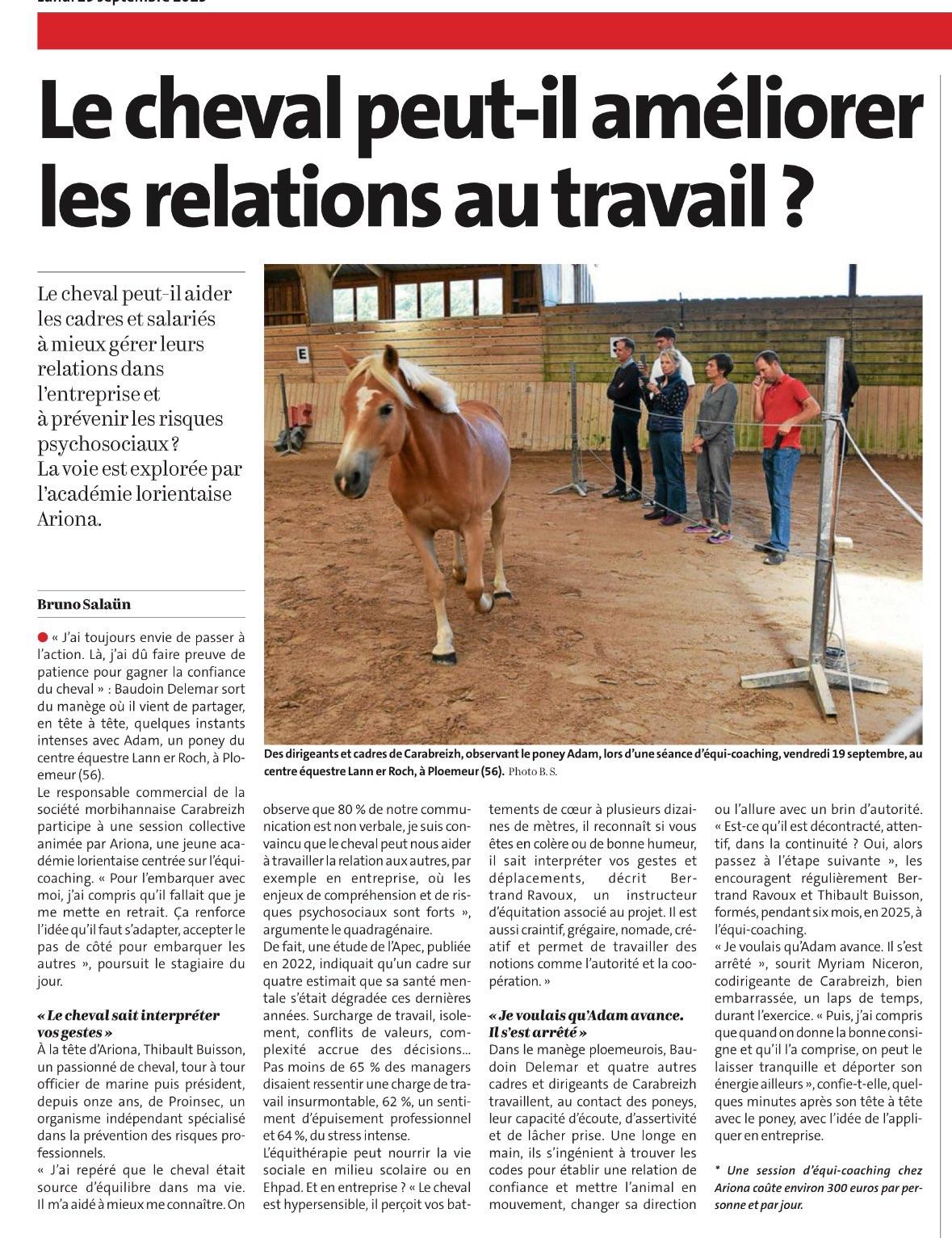 Derrière Ariona, il y a Thibaut Buisson – passionné de chevaux depuis l’enfance, formé à l’équi-coaching certifié Ifod – qui a eu deux vies professionnelles avant de créer Ariona. De ses classes en tant qu’Officier de Marine Nationale, il a gardé le goût de l’effort et le sens du devoir et du leadership. Passé sur les bancs d’HEC pour un Master en Entrepreneuriat, Thibaut a ensuite repris et développé l’organisme de formation Proinsec, spécialisé en santé, sécurité et bien-être au travail. Au contact de nombreux dirigeants et RH, il prend conscience que les organisations ont plus que jamais besoin de leaders alignés, d’équipes soudées et d’une communication authentique. L’équi-coaching est une réponse innovante et puissante à ces enjeux, qui allie ses deux passions pour l’humain et le cheval.